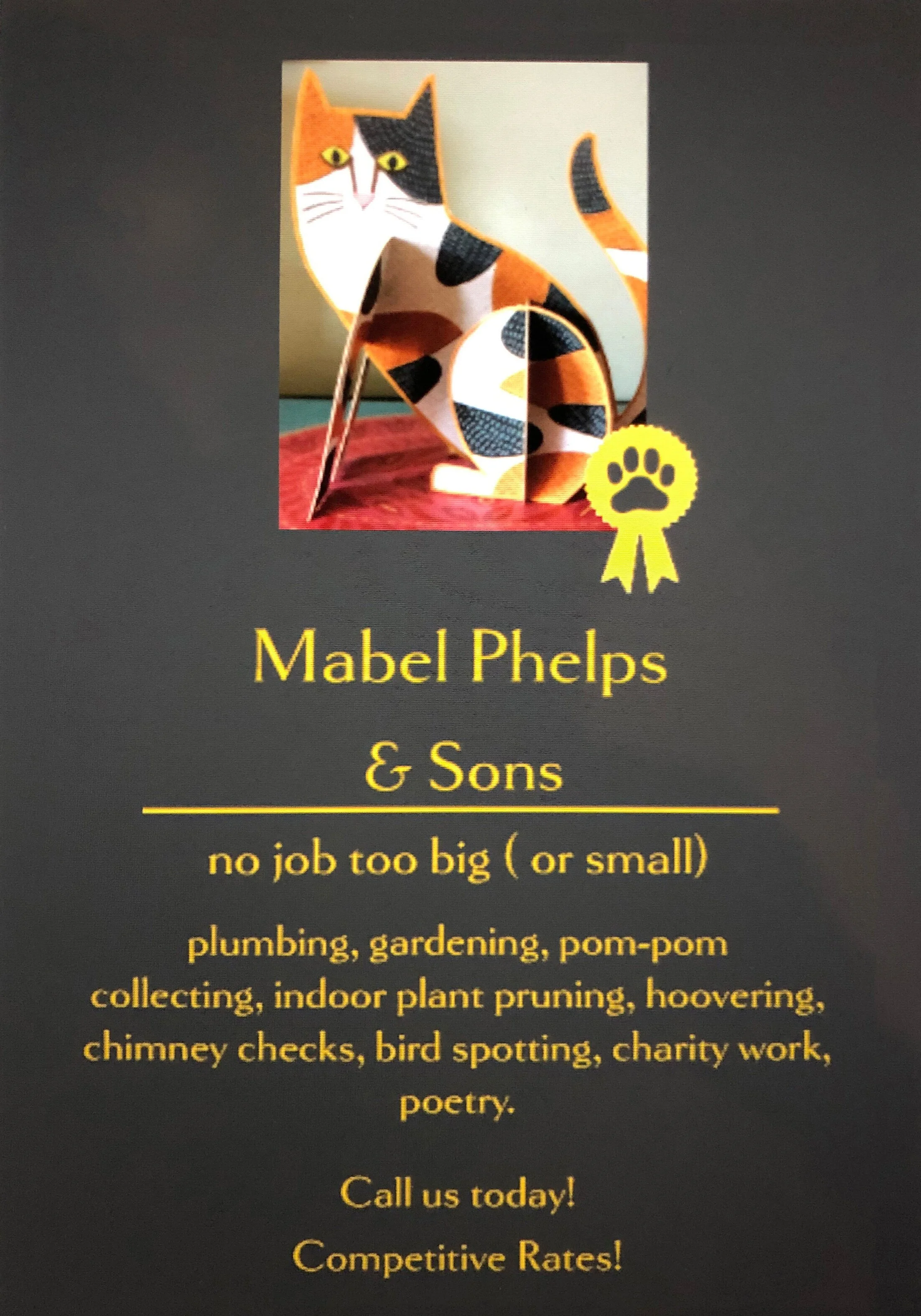 Business entrepreneur and visual artist, Mabel Phelps came to Hebden Bridge, with her sons Eric and Gordon, in late August 2019. She was approximately 17 months old and had been rescued by the Cats Protection League from dire living conditions. At the time, she was heavily pregnant and unwell. After six months with brilliant foster carers, during which she underwent extensive mouth surgery, Mabel and two of her young sons made the move. Having rapidly established themselves in the local scene, they set up their family business Mabel Phelps & Sons. My regular collaborators, here they are - in their own words: